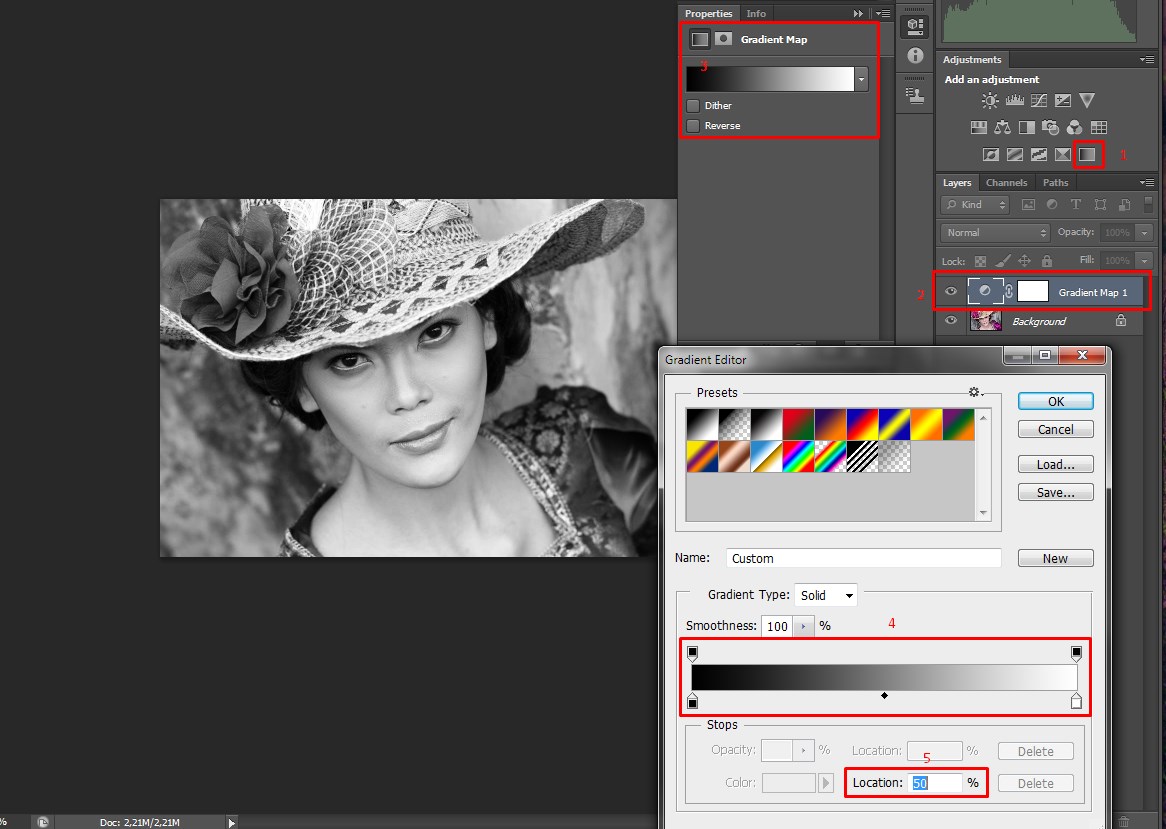 Atur gradient slide yang berada pada window gradient editor (pastikan anda memilih gradient hitam putih pada preset di bagian atas jendela ini) »